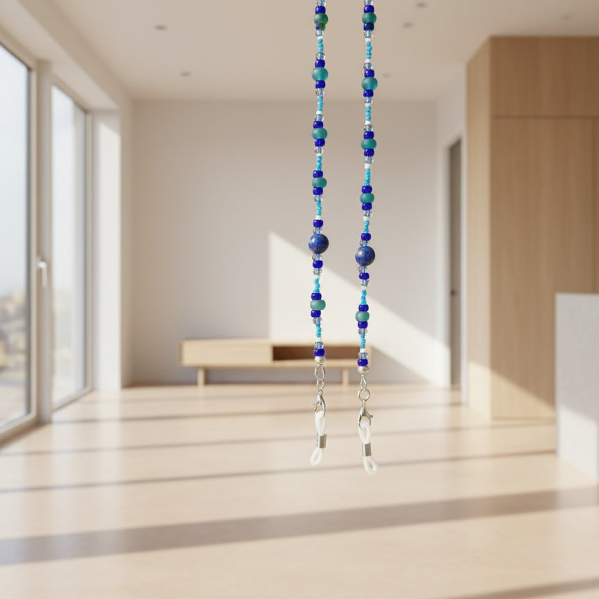 Keep your eyewear both protected and visually striking with these distinctive gemstone-adorned eyeglass holders. Crafted with 6 mm Lapis Lazuli stones and complementary 2 mm Cat's Eye quartz in soft sky blue and white tones, each piece is finished with blue and green glass bead accents. Measuring 22-24 inches and weighing just 18 grams, these holders offer practical wearability without sacrificing elegance. An ideal accessory for those who appreciate quality materials and refined design in their everyday essentials.